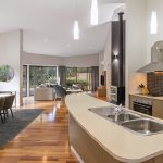 Architectural styled like over lapping stars this room is light and open plan with island kitchen bench finished in stone.