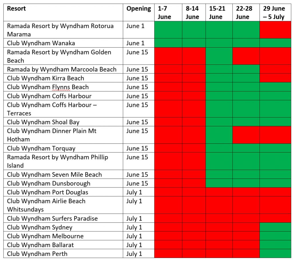 I am pleased to announce that we are opening up more resorts for Club Wyndham South Pacific owners to book during June and July.