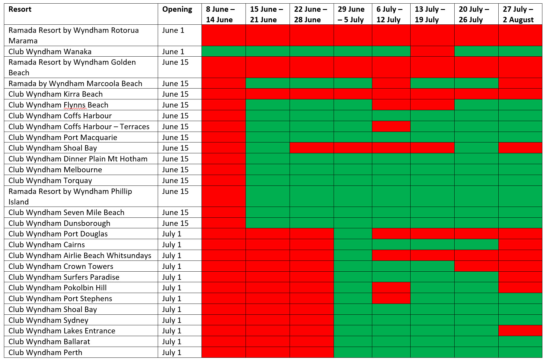 I am pleased to announce the removal of occupancy limits at some of your Club Wyndham South Pacific properties and a re-opening date for the remaining six contracted club resorts in Australia.